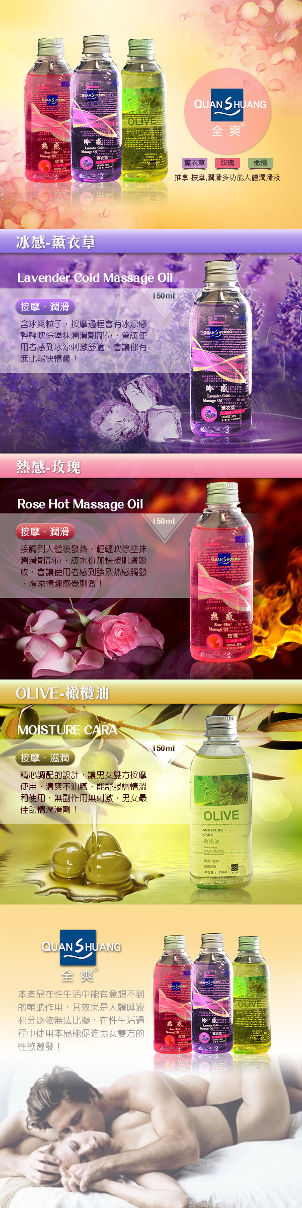 .主商品:Quan Shuang 性愛生活 按摩潤滑油 150ml 熱感 玫瑰